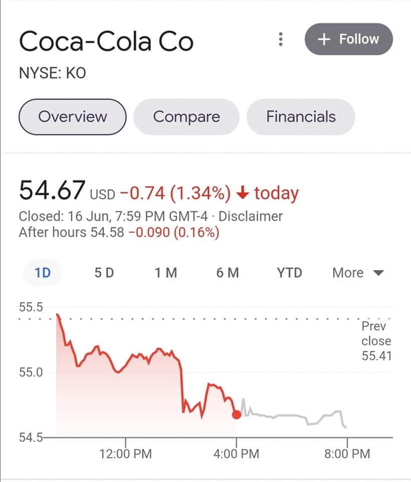 وهبطت أسهم شركة كوكاكولا من جديد ليغلق السهم أمس وعقب لقطة لوكاتيلي بالتحديد على 54.67 دولار، ومن المتوقع حدوث هبوط جديد في الأسهم.