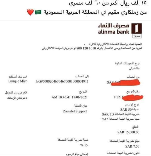 ساهم أحد مشجعي نادي الزمالك، يقيم بالمملكة العربية السعودية، بملغ 15 ألف ريال سعودي أي نحو 60 ألف جنيه لصالح حساب النادي.