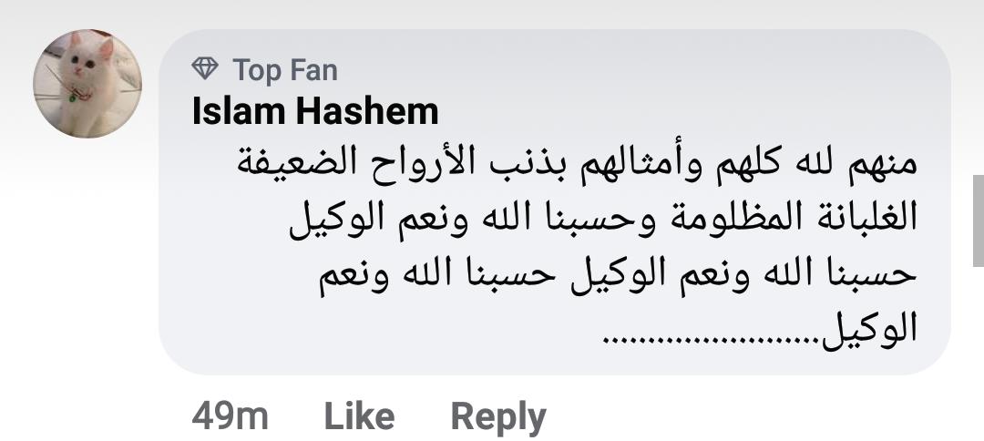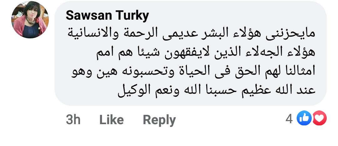 بينا كتب إسلام هشام: "منهم لله وحسبنا الله ونعم الوكيل"، بالإضافة إلى سوسن تركي: "ما يحزنني هؤلاء البشر عديمي الرحمة والإنسانية، هؤلاء الذين لا يفقهون شيئًا، حسبنا الله ونعم الوكيل".