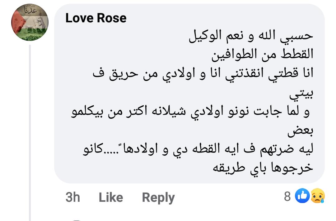 وقال حساب آخر: "حسبي الله ونعم الوكيل، القطط من الطوافين، أنا قطتي أنقذتني أنا وأولادي من حريق في بيتي، ولما جابت نونو أولادي شايلنها أكتر من إنهم بيكلموا بعض، ليه ضرتهم في ايه القطة دي وأولادها، كانوا خرجوها بأي طريقة".