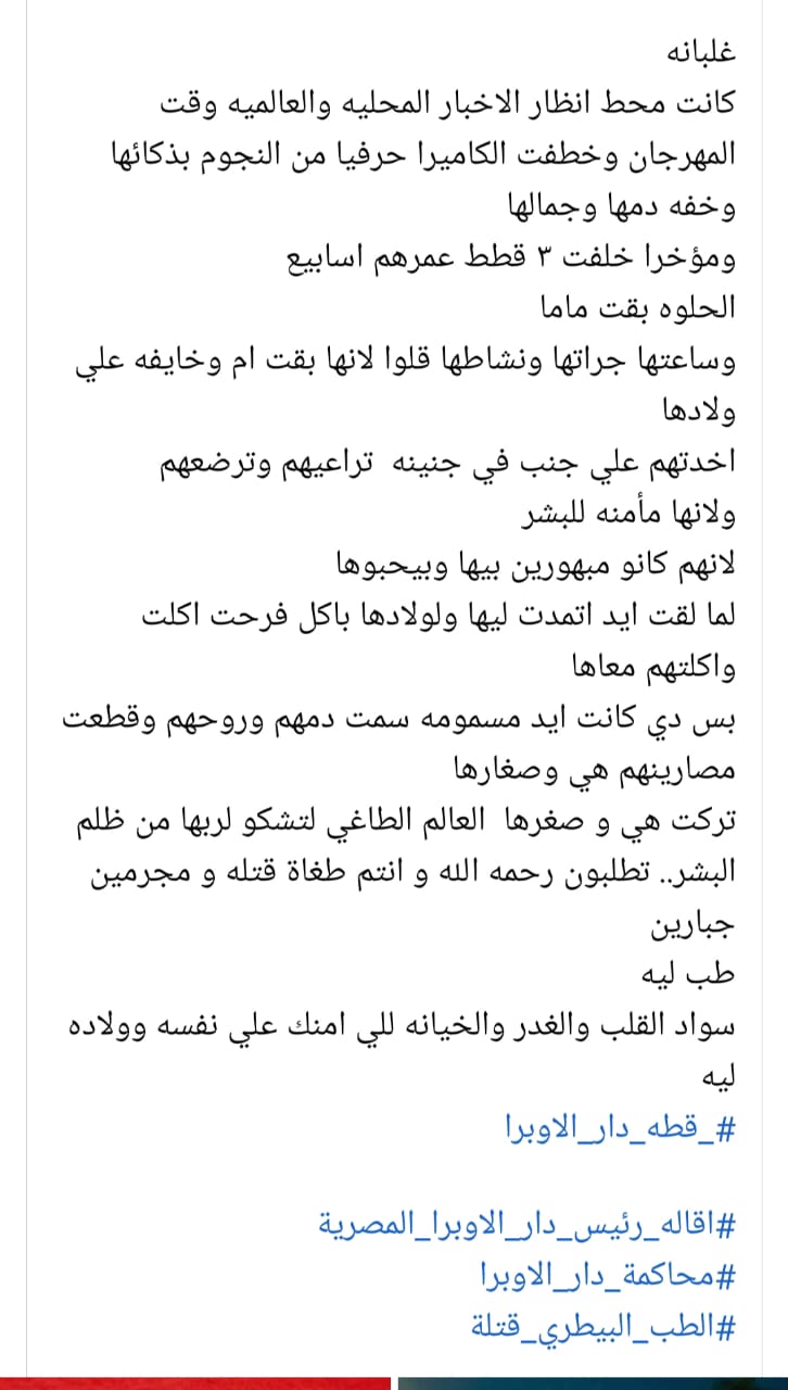 جدير بالذكر أن صفحة حملة الرفق بالحيوان، أكدت عبر صفحتها الخاصة على "فيس بوك"، مقتل القطة الشهيرة بعدما أنجبت 3 قطط داخل حديقة الأوبرا، وذلك بعد تناولها عبوة تونة سامة.