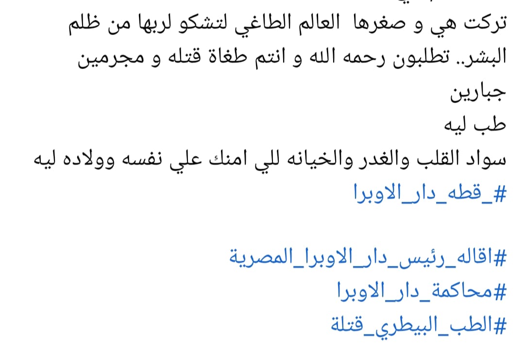 الأمر الذي أثار غضبًا واسعًا بين رواد السوشيال ميديا، متداولين بعض الأوسمة التي تعبر عن استنكارهم مما حدث التي تتضمن "محاكمة دار الأوبرا"، "الطب البيطري قتلة"، "إقالة رئيس دار الأوبرا".