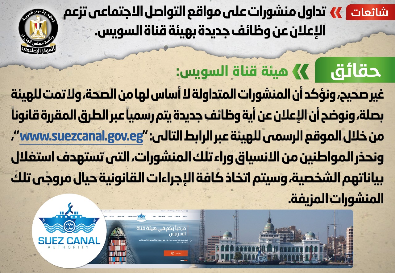 كشف المركز الإعلامي لمجلس الوزراء حقيقة تداول بعض صفحات التواصل الاجتماعي منشورات تزعم الإعلان عن وظائف جديدة بهيئة قناة السويس، وذلك من خلال التواصل مع هيئة قناة السويس.