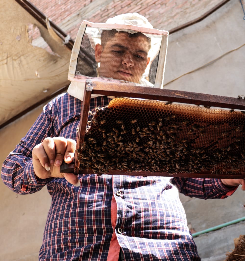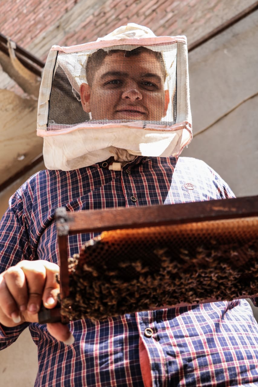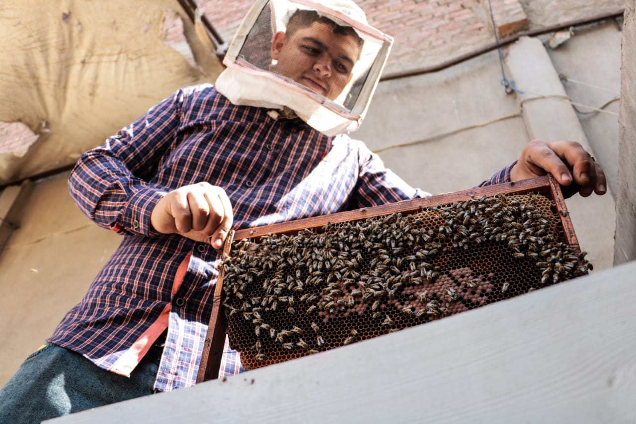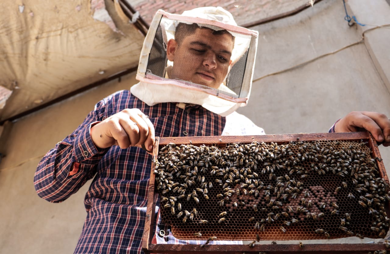 وتابع: "كان عندي 16 سنة أول ما بدأت المشروع، وكنت بعد المدرسة، بروح أشوف النحل والملكة والشغالات وصحتهم، وأشوف بيجيبوا حبوب لقاح أو عسل ولا لأ".