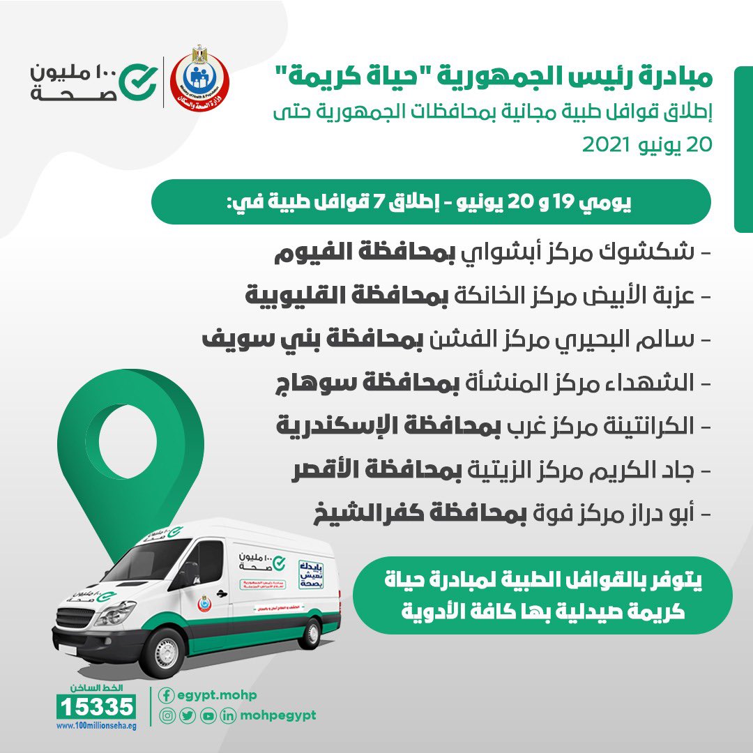 أعلنت وزارة الصحة والسكان، إطلاق 7 قوافل طبية ضمن مبادرة رئيس الجمهورية "حياة كريمة"، يومي 19 و20 يونيو للكشف والعلاج مجانًا.