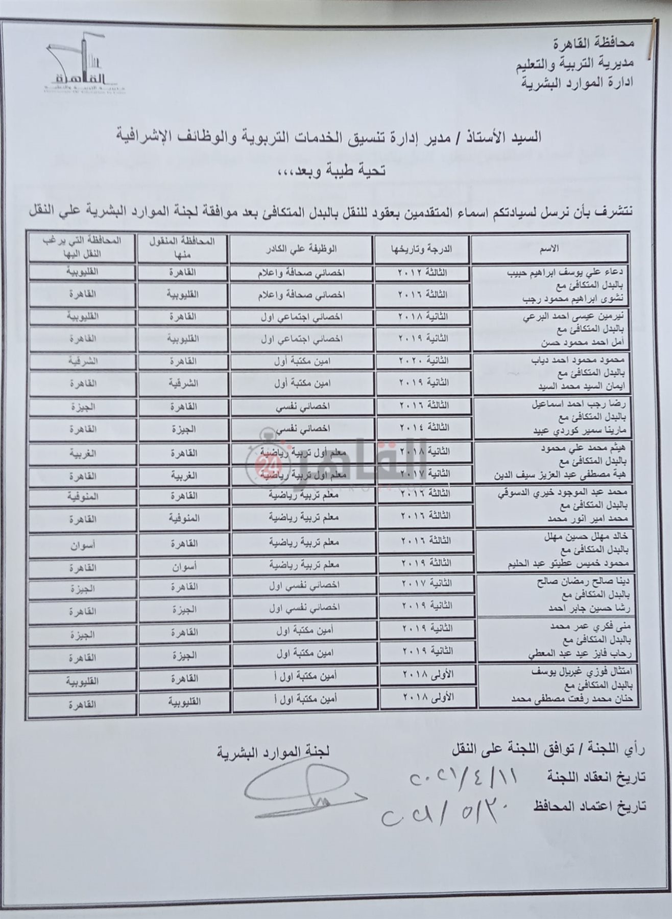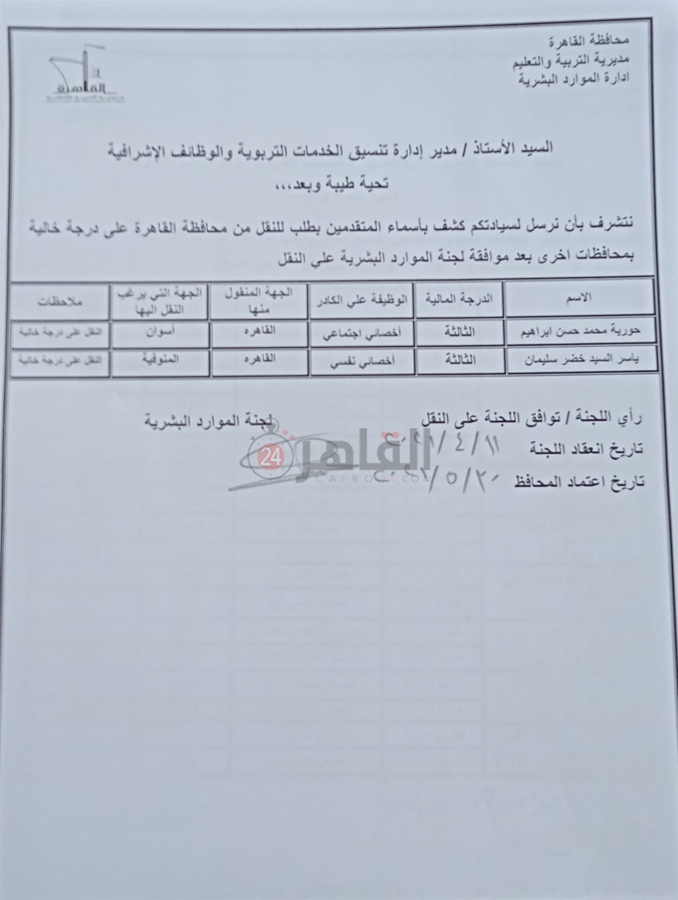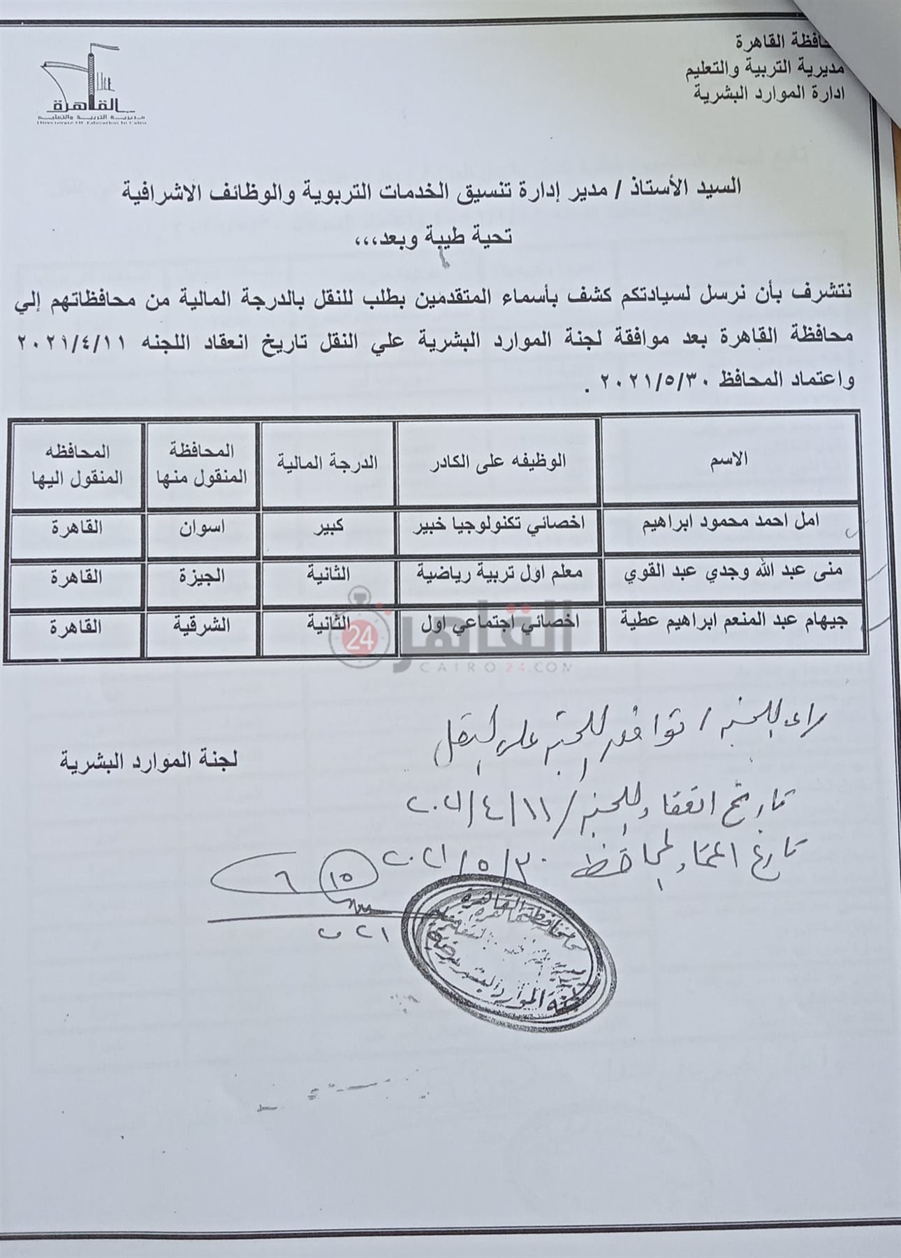 حصل "القاهرة 24" على كشوف أسماء المتقدمين بطلب للنقل بالدرجة المالية من محافظاتهم إلى محافظة القاهرة.