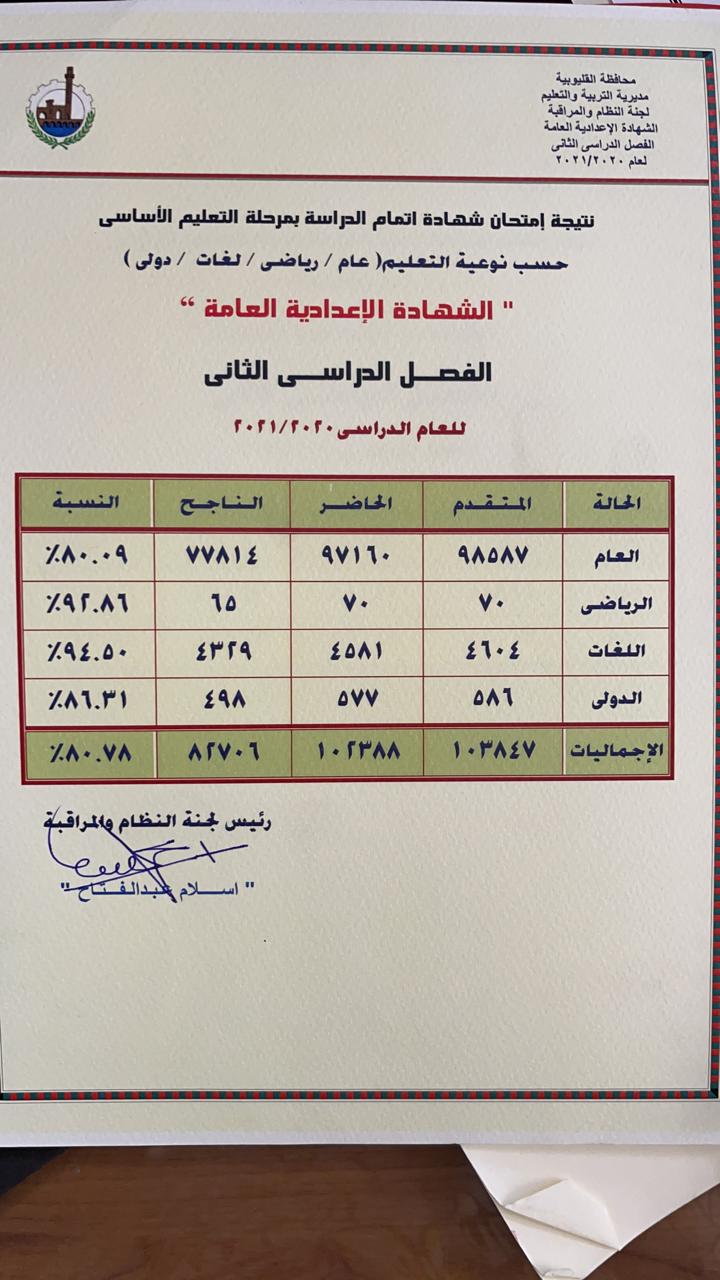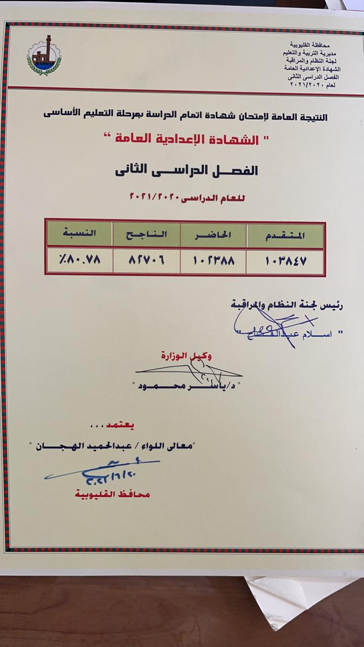 وكان قد اعتمد عبد الحميد الهجان محافظ القليوبية، اليوم، نتيجة الفصل الدراسي الأول لامتحان الشهادة الإعدادية بنسبة 80.78% بحضور الدكتور ياسر محمود وكيل وزارة التربية والتعليم بالمحافظة.