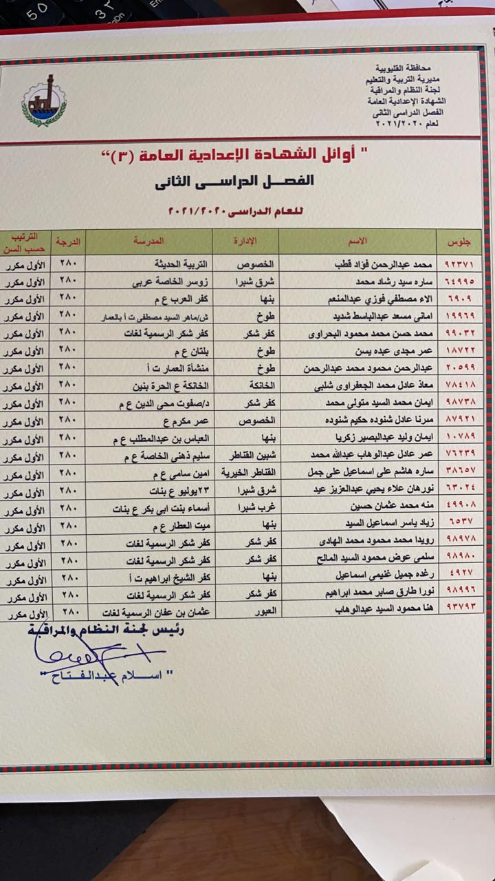 أعلنت منذ قليل محافظة القليوبية، لوحة شرف أوائل الشهادة الإعدادية للعام الدراسي 2020 – 20201، والتي شهدت حصول إدارة كفر شكر التعليمية على المركز الأول، بنسبة نجاح 95.02%.