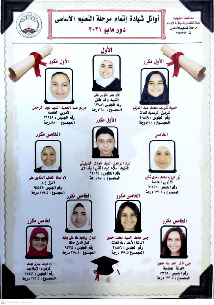 وضمت القائمة، الطالب عبد الرحمن السيد حمدي الشربيني، مدرسة الشهيد إسلام بغدادي بمدينة طلخا الأول مكرر بمجموع 280، والطالبة نور إيهاب محمد رمزي، مدرسة الاتربي الخاصة المشتركة باخطاب بمركز اجا بمجموع 279.5 درجة ترتيبها الخامس، والطالبة آلاء عماد القطب المكاوي علي، مدرسة النزل الإعدادية المشتركة بمنية النصر بمجموع 279.5 درجة الخامس مكرر، والطالبة جنى محمد السيد محمد حسن، مدرسة الدلتا للغات بطلخا الخامس مكرر بمجموع 279.5 درجة.
