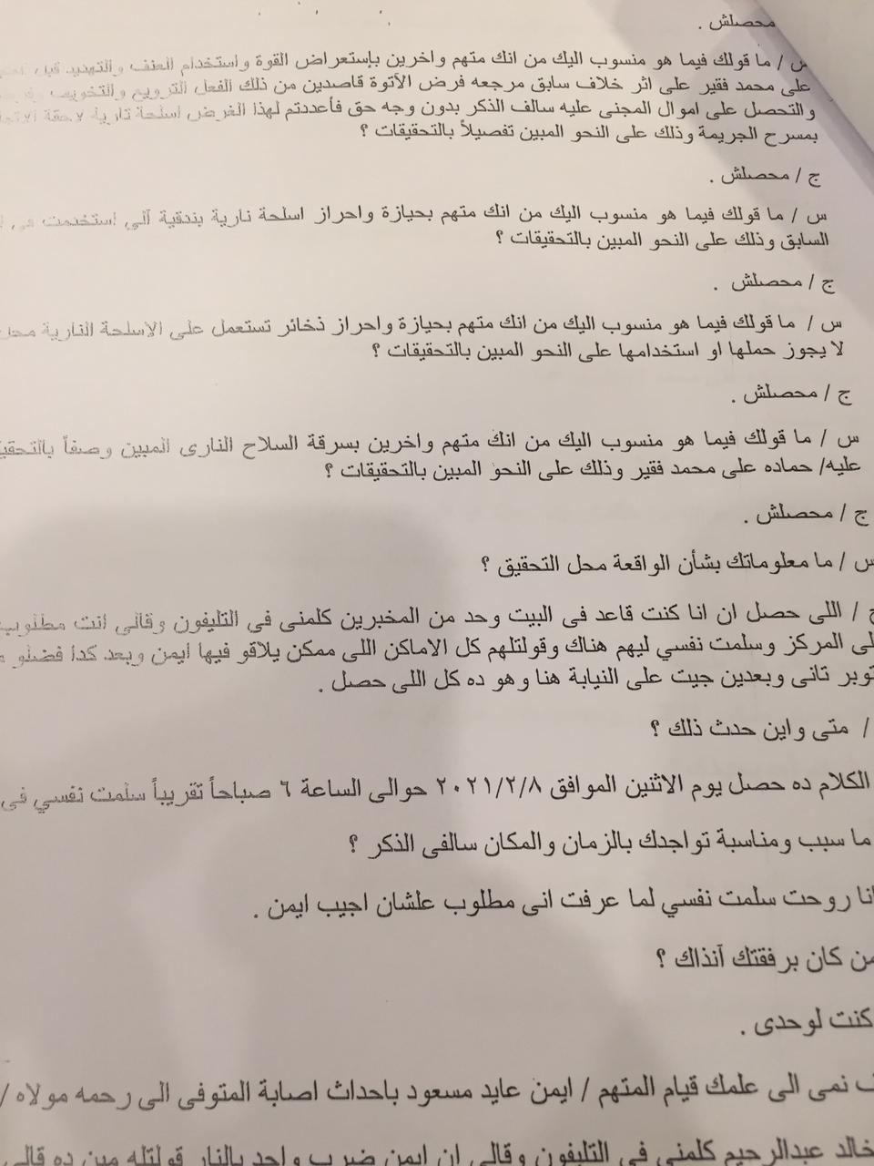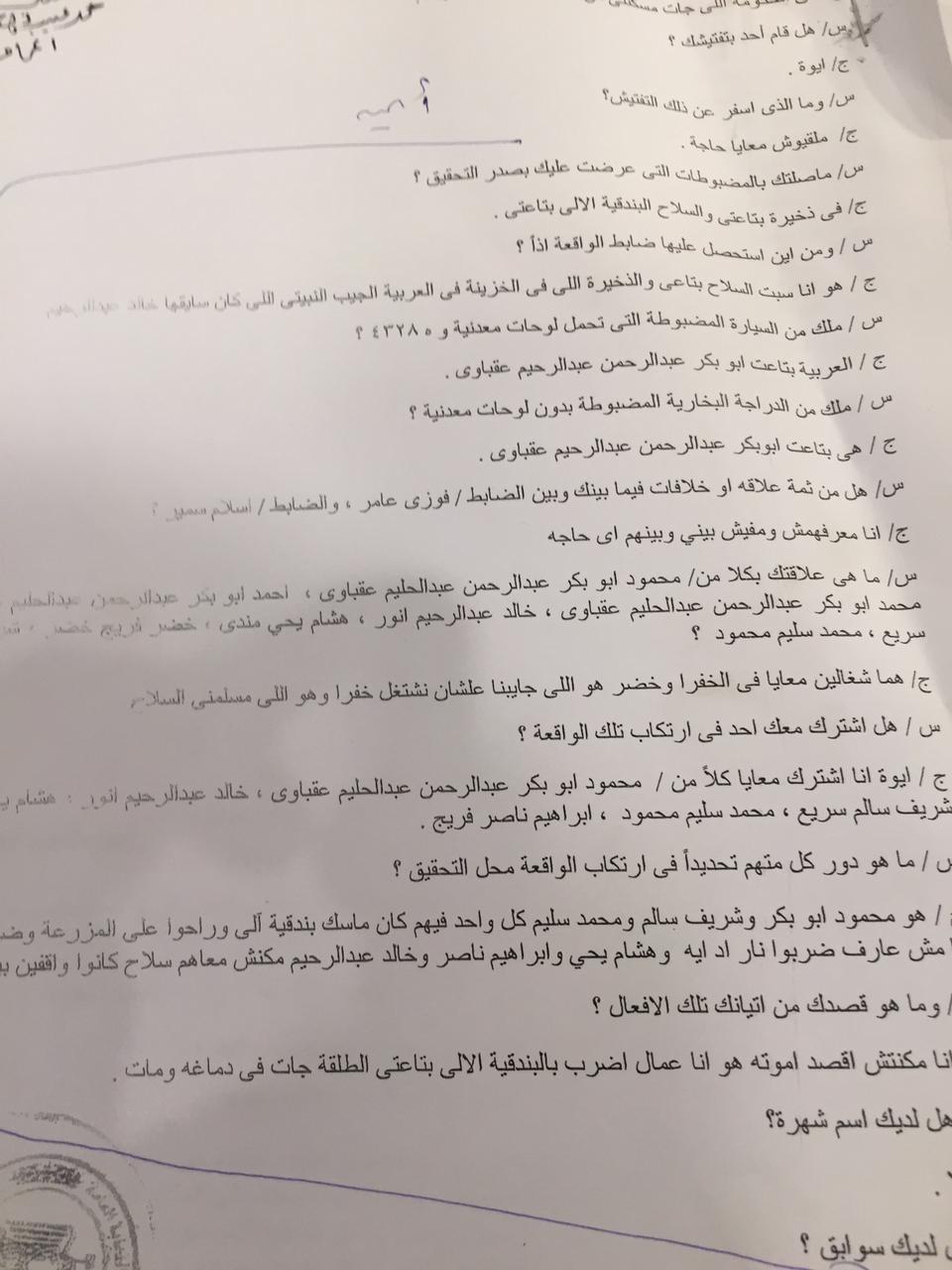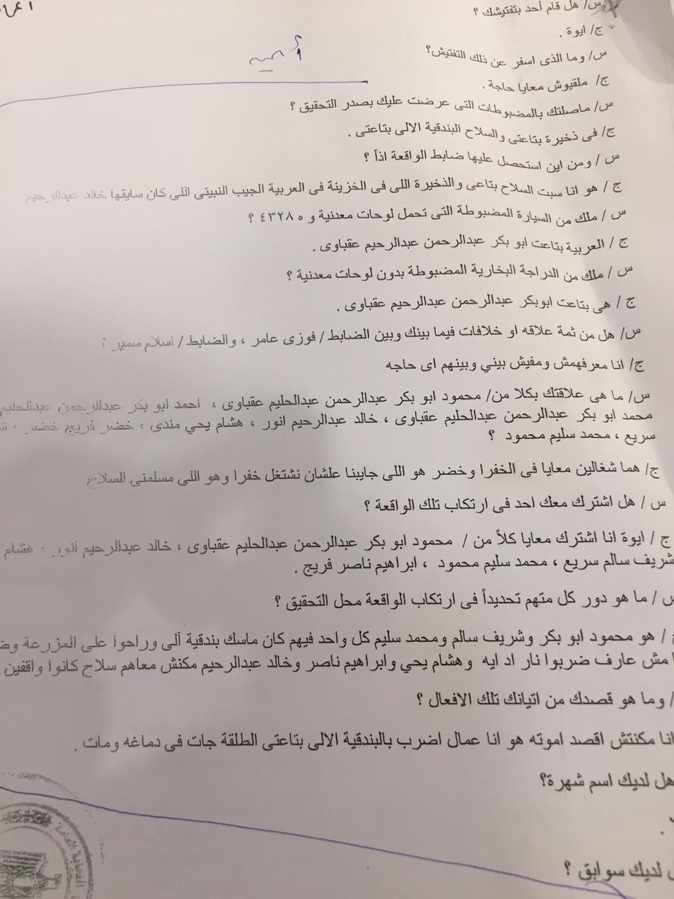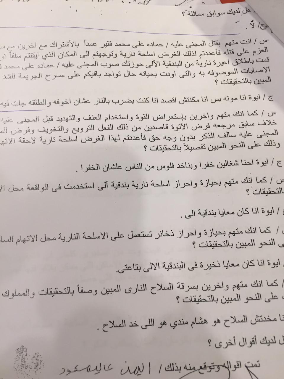 وتابع المتهم بأن “محمود وشريف ومحمد كل واحد فيهم كان ماسك بندقيه آلي وراحوا على المزرعة وضربوا نار بس أنا مش عارف ضربوا نار قد إيه وهشام يحي وإبراهيم وخالد مكنش معاهم سلاح كانوا واقفين بيتفرجوا.. وأنا مكنتش أقصد أموته هو أنا عمال أضرب بالبندقية الآلي بتاعتي الطلقة جات في دماغه ومات".