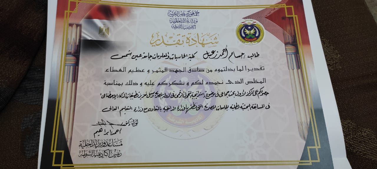 وكُرم طلاب كلية الحاسبات والمعلومات بجامعة عين شمس، الفائزون بالمركز الأول في المسابقة التي أقيمت يوم السبت 12/6/2021.