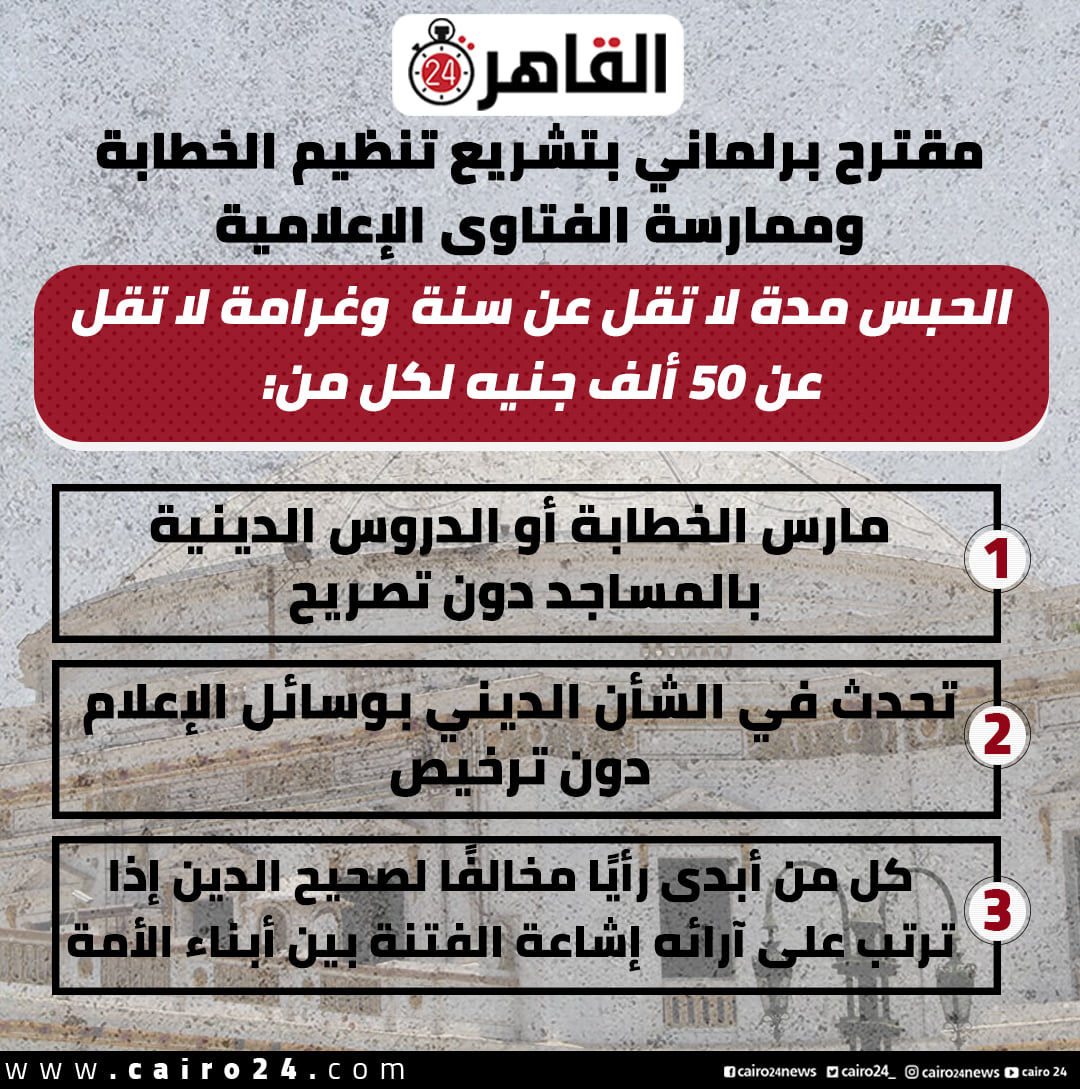 ينشر "القاهرة 24" إنفوجرافيك يوضح أبرز النقاط بشأن القانون المقترح، بتنظيم الخطابة وممارسة الفتاوى الإعلامية.