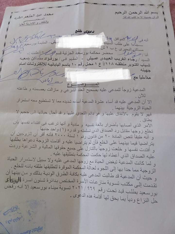 الأم ذكرت في دعواها، أن الزوج البالغ من العمر 77 عامًا، والذي عاشت معه على مدار زمن طويل، لا يُحسن مُعاشرتها، ويعتدي عليها، ويُحدث بها أضرارًا نفسية ومعنوية ومادية، وطالبت برد المهر الذي يبلغ جنيهًا واحدًا وتسليمه له عن طريق المحكمة بالدعوى رقم 969 لسنة 2021.