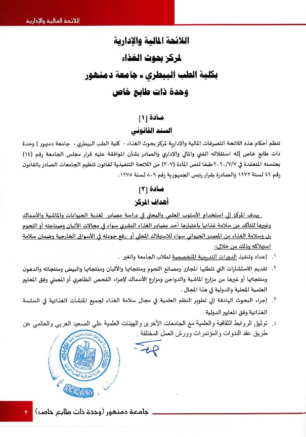 وأشار، رئيس جامعة دمنهور، وفق بيان اعلامي اليوم الثلاثاء، إلى أن السند القانوني لتنظيم أحكام هذه اللائحة للتصرف المالي والإداري لمركز بحوث الغذاء بكلية الطب البيطري، (وحدة ذات طابع خاص له استقلاله الفني والمالي والإداري يرجع إلى قرار مجلس الجامعة رقم 14 بجلسته المنعقدة في 7 يوليو 2020 طبقا لنص المادة 307 من اللائحة التنفيذية لقانون تنظيم الجامعات الصادر بالقانون رقم 49 لسنة 1972 والصادرة بقرار رئيس الجمهورية رقم 809 لسنة 1975.