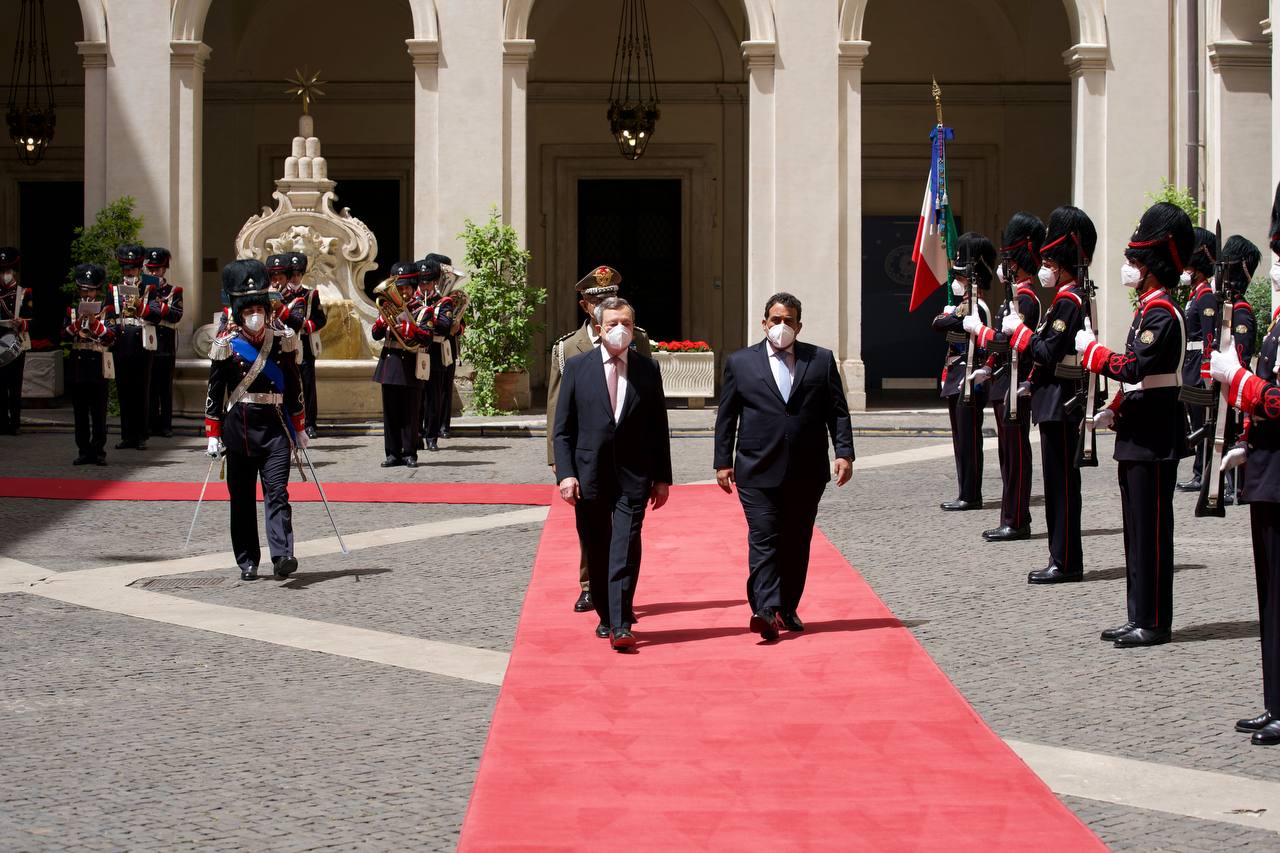 استقبل رئيس الوزراء الإيطالي ماريو دراغي، اليوم الثلاثاء، رئيس المجلس الرئاسي الليبي الدكتور محمد المنفي، الذي وصل صباح اليوم للعاصمة الإيطالية روما في زيارة عمل رسمية.