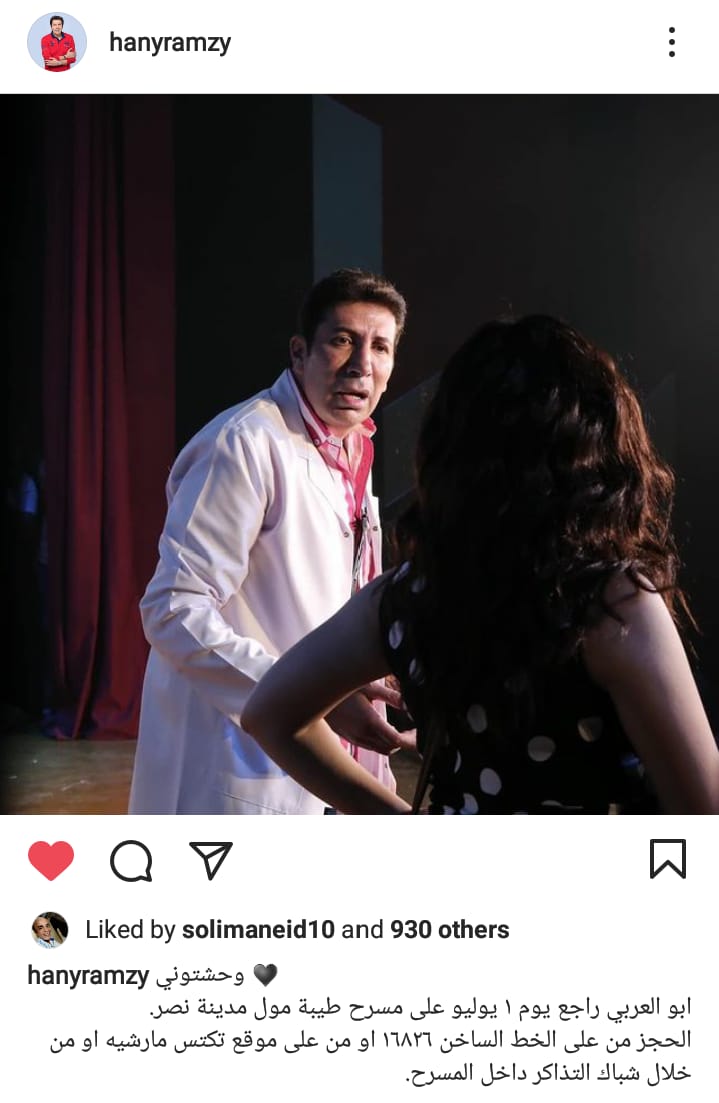 أعلن الفنان هاني رمزي استكمال عرض مسرحية "أبو العربي في Mission Impossible" التي سبق وتم عرضها يوم الجمعة 14 مايو ثاني أيام عيد الفطر.