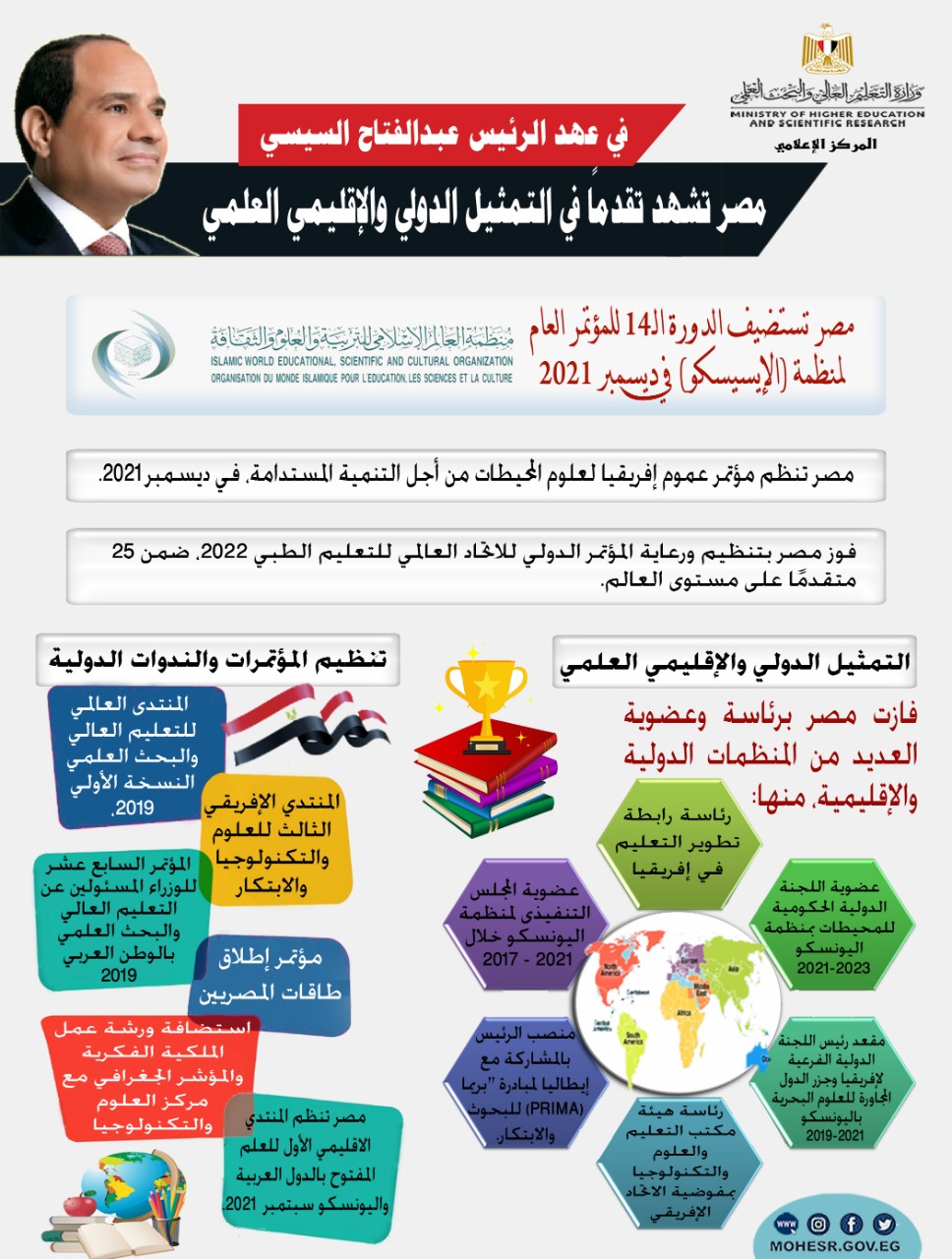"التعليم العالي": تقدم مصر في التمثيل الدولي والإقليمي العلمي خلال عهد السيسي ( إنفوجراف)