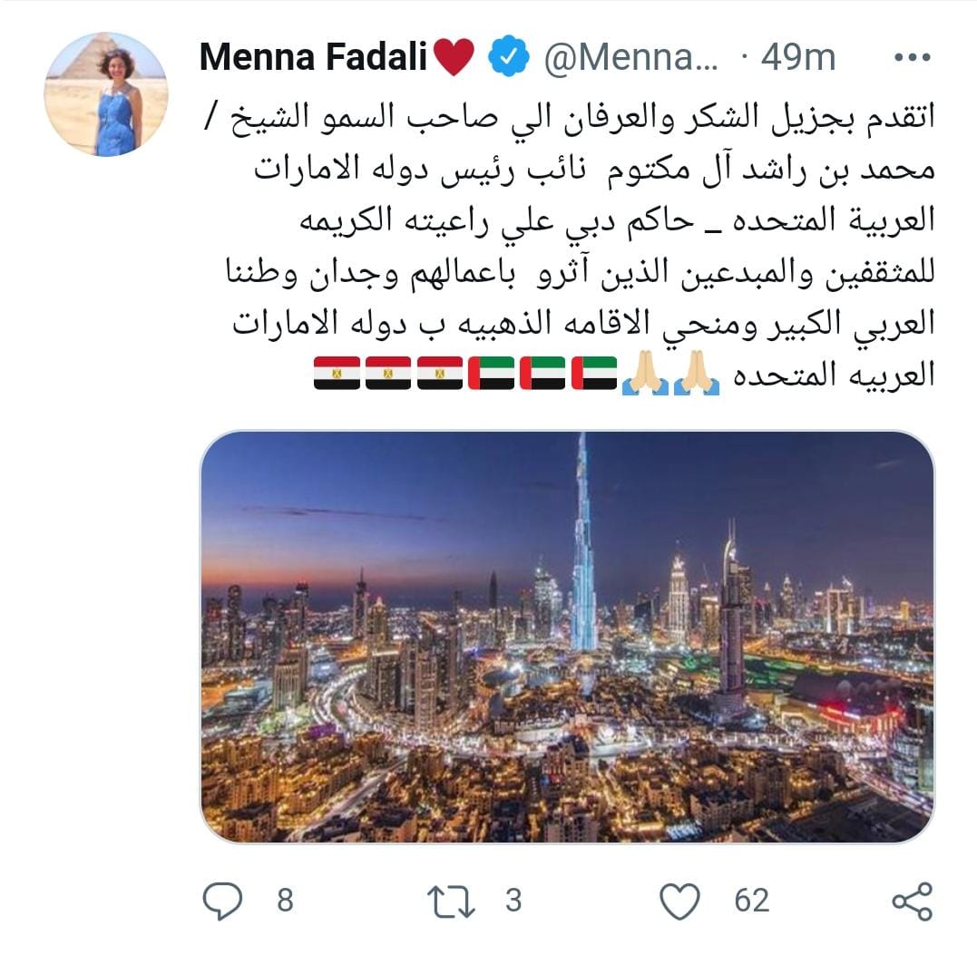 أعربت الفنانة عن شكرها لدبي وامتناها لهذه المنحة، إذ نشرت صورة لعلم دولة الإمارات، بحسابها الشخصي على موقع "إنستجرام"، وكتبت: "جزيل الشكر والعرفان لبلدى الثانى، ومسقط رأسي، دولة الإمارات العربية المتحدة، وحكومة دبي الموقرة على منحي الإقامة الذهبية على أرضها.. حفظ الله إماراتنا حكومة، وشعبًا".