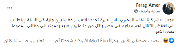 وكتب فرج عامر عبر حسابه الرسمي على موقع التواصل الاجتماعي "فيس بوك"، "عجيب عالم كرة القدم المصري ناس عايزة تجدد للاعب بـ80 مليون جنيه في السنة، وبتطالب إني أخفض انتقال أهم مهاجم في مصر بأقل من 40 مليون جنية بدعوى إني مغالي، عموما قضي الأمر".