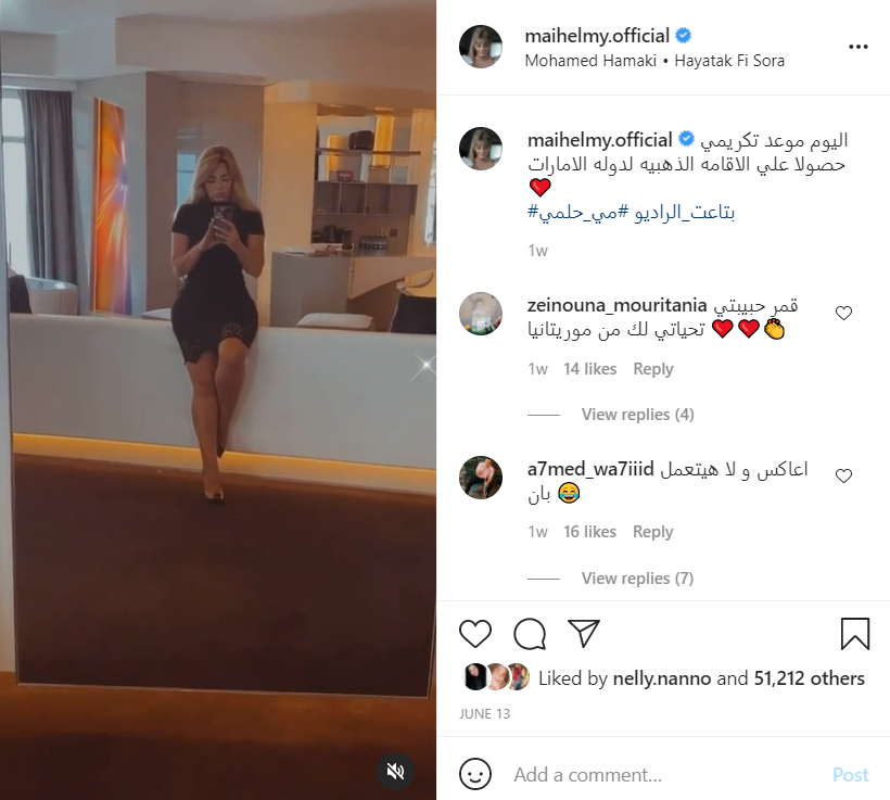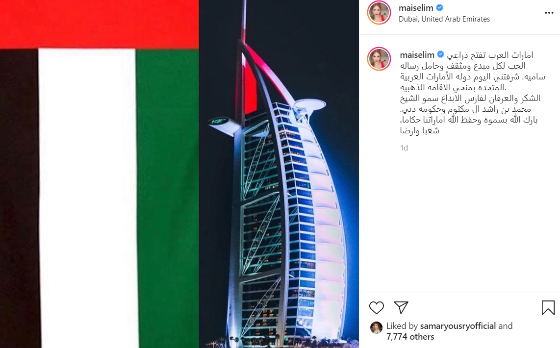 حصلت الفنانة مي سليم على الإقامة الذهبية، وحرصت على توجيه الشكر لدولة الإمارات على هذه المنحة، ونشرت صورة لعلم الدولة، وعلقت قائلة: "إمارات العرب تفتح ذراعي الحب لكل مبدع ومثقف، وحامل رسالة سامية.. شرفتني اليوم دولة الإمارات العربية المتحدة بمنحي الإقامة الذهبية، الشكر والعرفان لفارس الإبداع سمو الشيخ محمد بن راشد آل مكتوم وحكومة دبي، بارك الله بسموه وحفظ الله إماراتنا حكامًا، وشعبًا وأرضًا".
