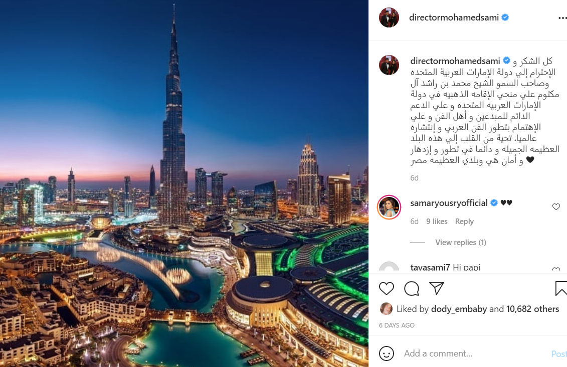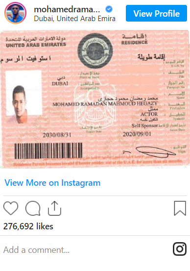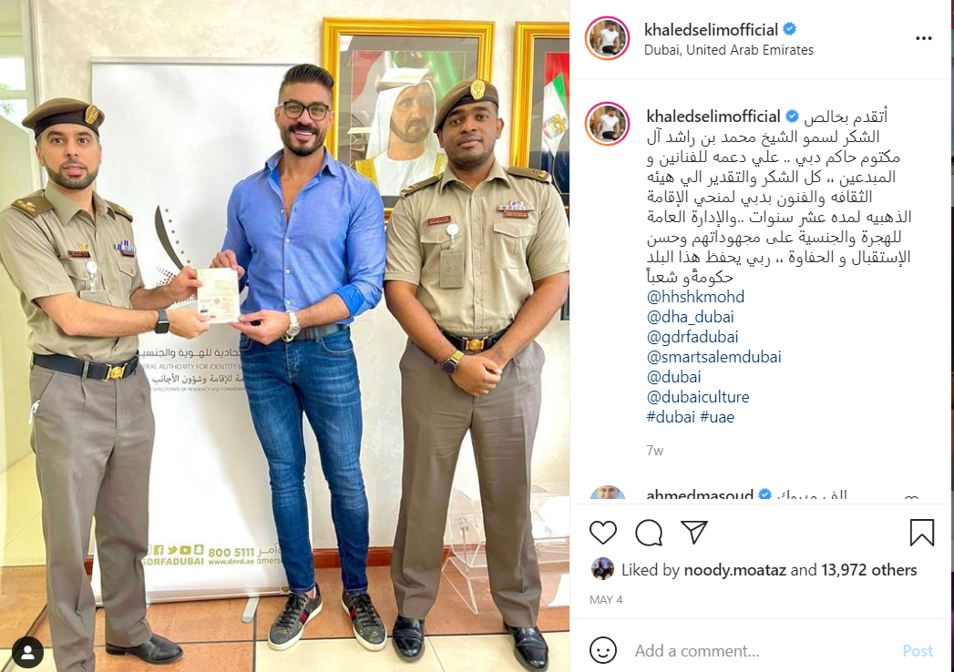 أعلن منذ أيام حصوله على "الإقامة الذهبية"، ونشر عبر حسابه الشخصي على موقع "إنستجرام"، صورة لدولة الإمارات العربية المتحدة، مُوجهًا الشكر لها وللشيخ محمد بن راشد آل مكتوم، وعلق قائلًا: “كل الشكر والاحترام إلى دولة الإمارات العربية المتحدة، وصاحب السمو الشيخ محمد بن راشد آل مكتوم، على منحي الإقامة الذهبية في دولة الإمارات العربية المتحدة، وعلى الدعم الدائم للمبدعين، وأهل الفن، وعلى الاهتمام بتطور الفن العربي وانتشاره عالميًا.. تحية من القلب إلى هذه البلد العظيمة الجميلة، ودائمًا في تطور وازدهار وأمان، هي وبلدي العظيمة مصر”.