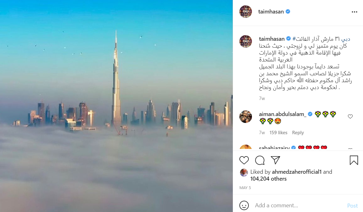 أعلن الفنان تيم حسن حصوله وزوجته على الإقامة الذهبية بدولة الإمارات العربية، وعبّر عن سعادته بها، إذ نشر صورة بحسبه الشخصي على موقع "انستجرام"، وعلق عليها: "30 مارش آذار الفائت كان يوم متميز لي ولزوجتي، حيث مُنحنا فيها الإقامة الذهبية في دولة الإمارات العربية المتحدة..نَسعد دايمًا بوجودنا بهذا البلد الجميل..شكرًا جزيلًا لصاحب السمو الشيخ محمد بن راشد آل مكتوم، حفظه الله حاكم دبي وشكرًا لحكومة دبي دمتم بخير وأمان ونجاح".