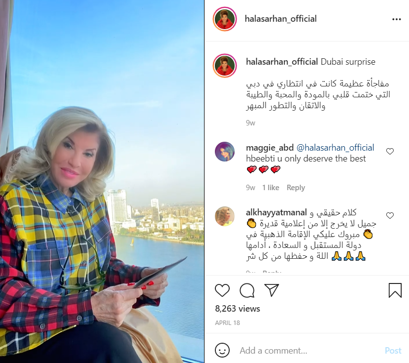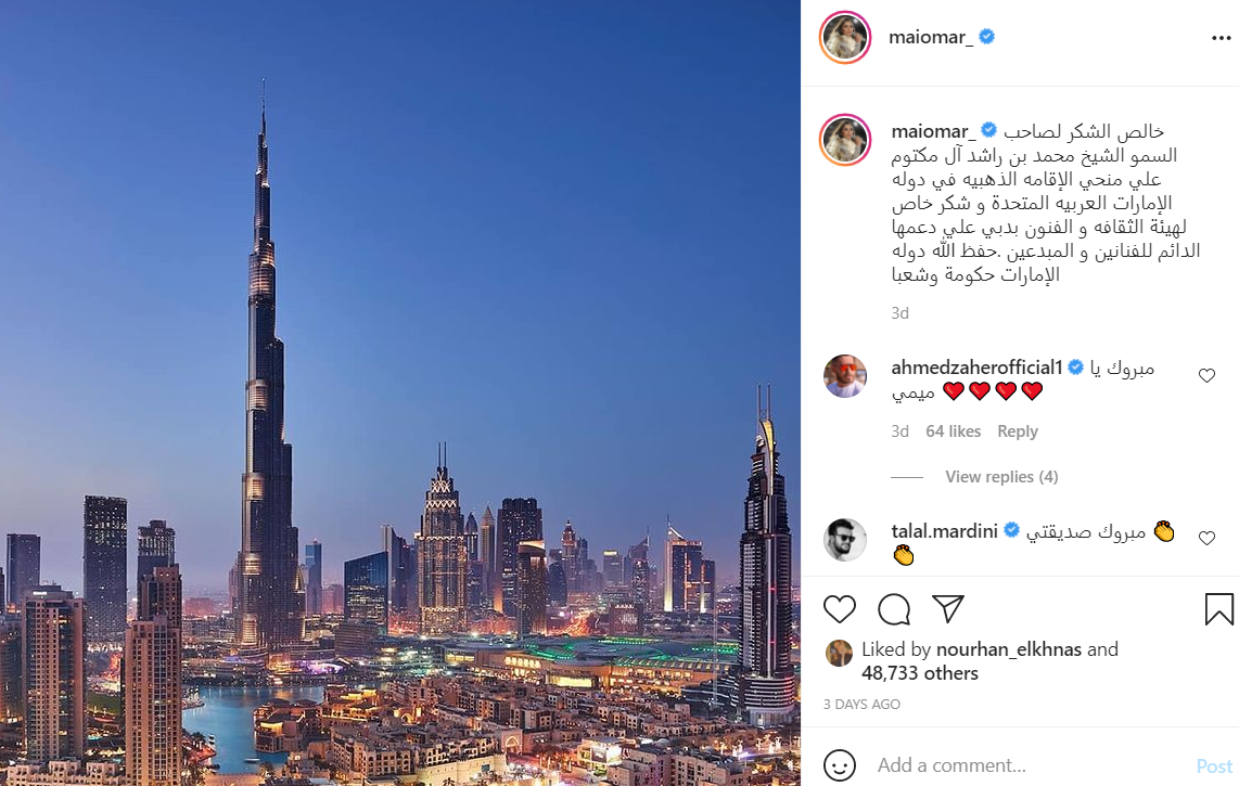 أعربت الفنانة عن شكرها لدبي وامتناها لهذه المنحة، إذ نشرت صورة لعلم دولة الإمارات، بحسابها الشخصي على موقع "إنستجرام"، وكتبت: "جزيل الشكر والعرفان لبلدي الثاني، ومسقط رأسي، دولة الإمارات العربية المتحدة، وحكومة دبي الموقرة على منحي الإقامة الذهبية على أرضها.. حفظ الله إماراتنا حكومة، وشعبًا".