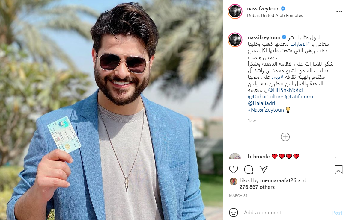 حصل الفنان اللبناني ناصيف زيتون على الإقامة الذهبية في الإمارات، ونشر عبر حسابه الشخصي بموقع "إنستجرام" صورة بالهوية الإماراتية، وعلق عليها: "الدول مثل البشر معادن، والإمارات معدنها ذهب، وقلبها ذهب، وهي التي فتحت قلبها لكل مبدع وفنان ومحب، شكرًا للإمارات على الإقامة الذهبية".