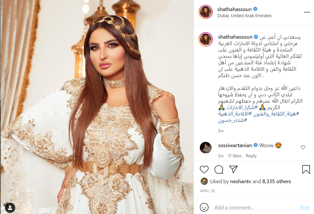 حصلت على الإقامة الذهبية، ونشرت بحسابها الشخصي على “انستجرام”، وعلقت: “يسعدني أن أعبر عن فرحتي وامتناني لدولة الامارات العربية المتحدة وهيئة الثقافة والفنون على ثقتكم العالية التي أوليتموني إياها بمنحي شهادة اعتماد فئة المبدعين من أهل الثقافة والفن والإقامة الذهبية على أن أكون عند حسن ظنكم”.