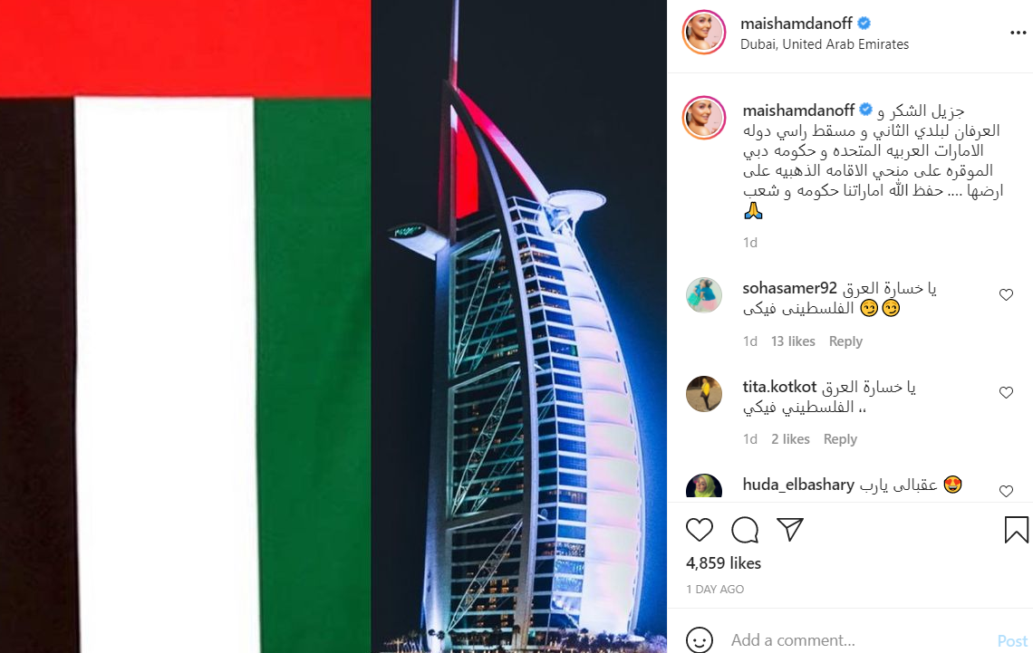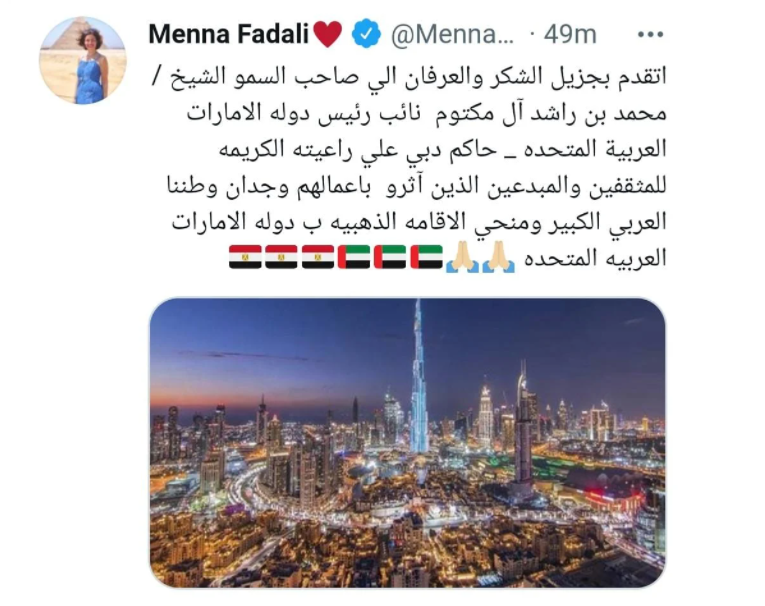 وتابعت: "داعين الله عز وجل بدوان التقدم والازدهار لبلدي الثاني دبي وان يحفظ شيوخها الكرام اطال الله عمرهم وحفظهم لشعبهم الكريم".