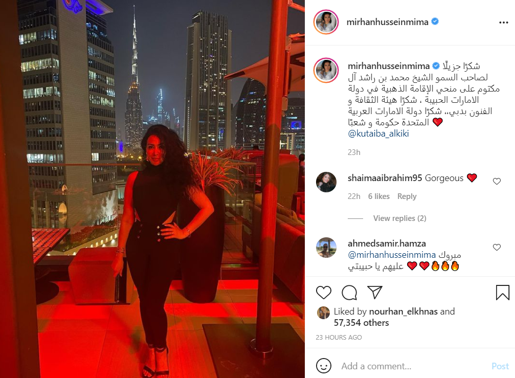 نشرت ميريهان صورة لها على “إنستجرام” من دبي، مُعبرة عن فرحتها، قائلةً: "شكرًا جزيلًا لصاحب السمو الشيخ محمد بن راشد آل مكتوم على منحي الإقامة الذهبية فى دولة الإمارات الحبيبة، شكرًا هيئة الثقافة والفنون بدبي، شكرًا دولة الإمارات العربية المتحدة حكومة، وشعبًا".