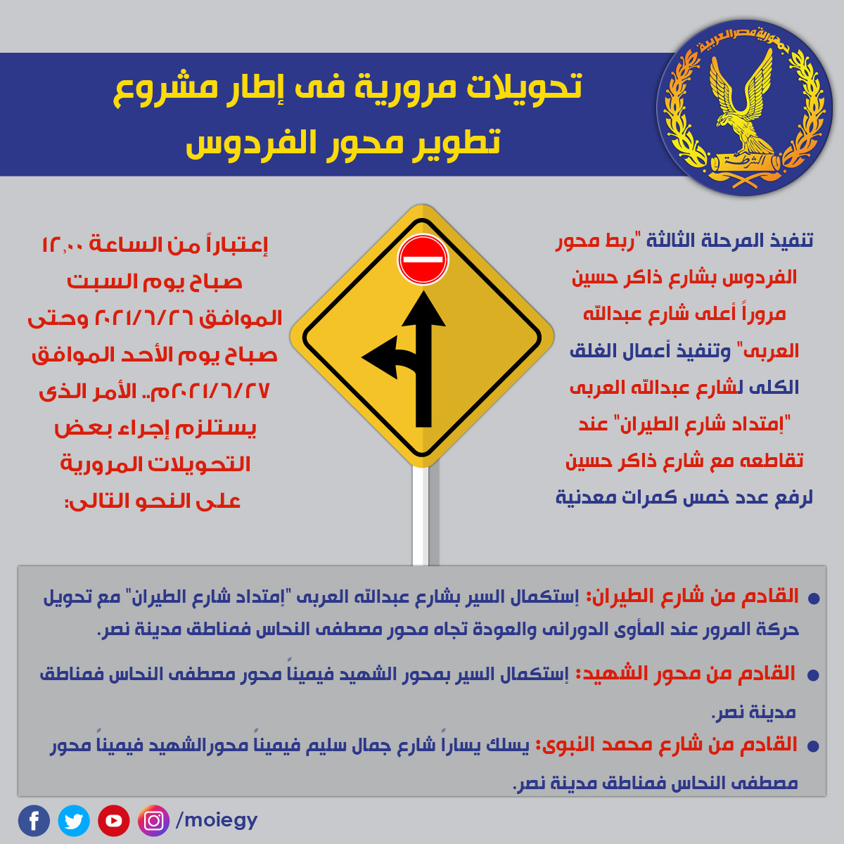 أعلنت الإدارة العامة لمرور القاهرة عن تحويلات مرورية، نتيجة تنفيذ المرحلة الثالثة من التطوير "ربط محور الفردوس بشارع ذاكر حسين مرورًا أعلى شارع عبدالله العربي"، وتنفيذ أعمال الغلق الكلي لشارع عبدالله العربي "امتداد شارع الطيران" عند تقاطعه مع شارع ذاكر حسين، لرفع خمس كمرات معدنية، اعتبارًا من الساعة 12،00 صباح غد السبت، وحتى صباح بعد غد الأحد، الأمر الذى يستلزم إجراء بعض التحويلات المرورية على النحو التالي:
