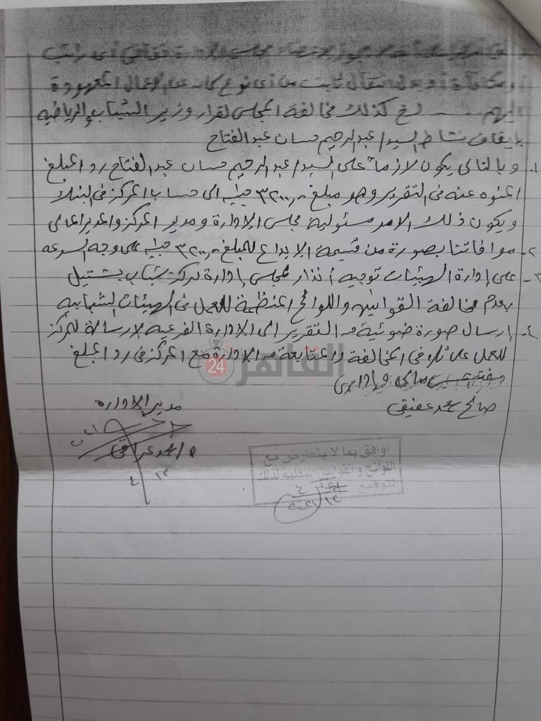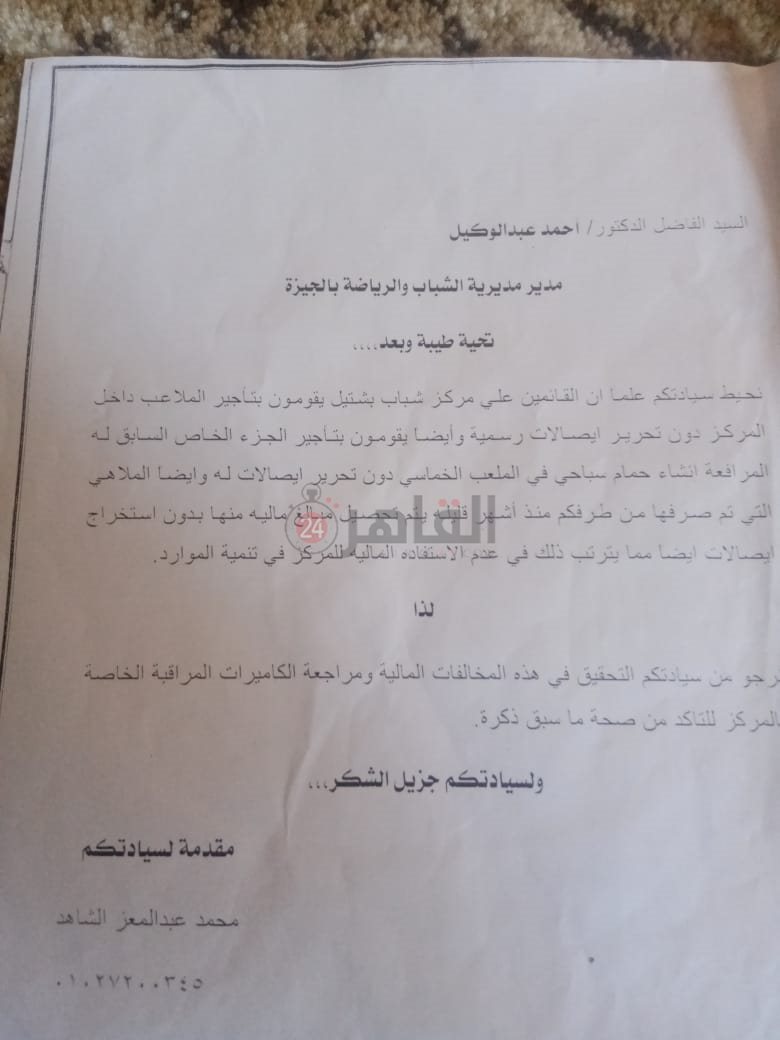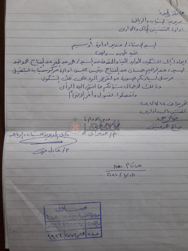 وأوضح الشاهد، في تصريحات خاصة لـ"القاهرة 24"، أن هناك لجنة من التفتيش المالي والإداري التابعة لمديرية الشباب والرياضة بالجيزة، رصدت المخالفات التي تم ذكرها في الشكوى.