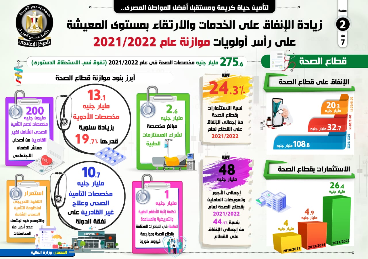 وفيما يتعلق بقطاع الصحة، كشف التقرير عن وصول مخصصات القطاع في عام 2021/2022 إلى 275.6 مليار جنيه بما يفوق نسب الاستحقاق الدستوري، هذا وبلغ حجم الإنفاق على القطاع 108.8 مليار جنيه، مقارنةً بـ 32.7 مليار جنيه عام 2013/ 2014، و20.3 مليار جنيه عام 2010/ 2011.