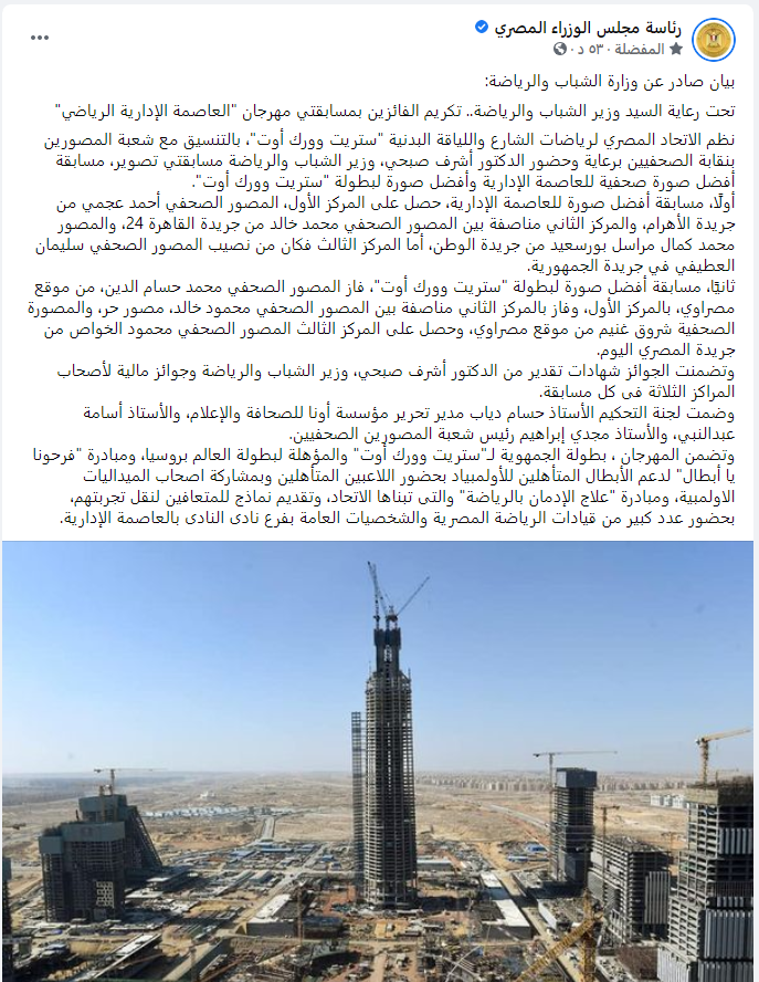 نشر مجلس الوزراء عبر صفحته على “فيس بوك”، تكريم الفائزين في مسابقة أفضل صورة للعاصمة الإدارية، والتى شملت فوز مصور “القاهرة 24” بالمركز الثاني.