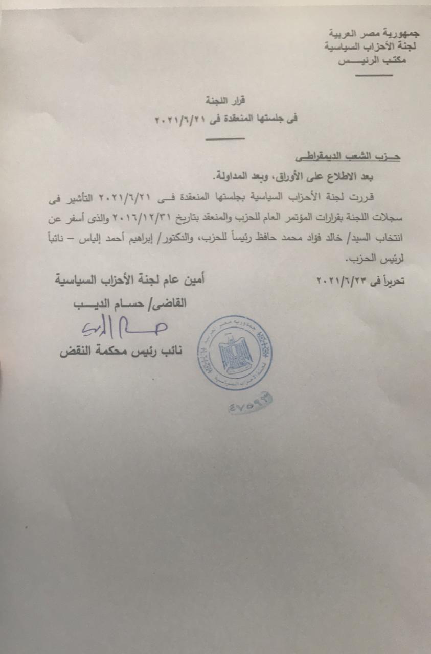 قررت لجنة الأحزاب السياسية بجلستها المنعقدة في 21 يونيو 2021، التأشير في سجلات اللجنة بقرارات المؤتمر العام للحزب، والمنعقد بتاريخ 31 ديسمبر 2016، والذي أسفر عن انتخاب خالد فؤاد محمد حافظ رئيسا لحزب الشعب الديمقراطي، والدكتور إبراهيم أحمد إلياس، نائبة لرئيس الحزب.