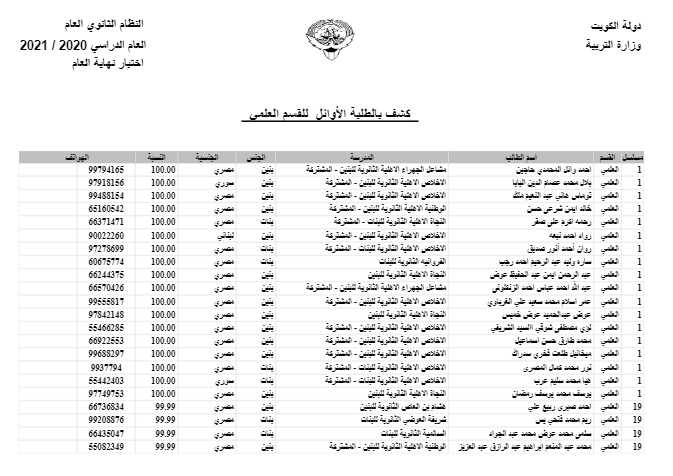 اعتمد الدكتور علي المضف، وزير التربية والتعليم في الكويت، نتائج الثانوية العامة بأقسامها العلمي والأدبي والديني للعام الدراسي 2020 – 2021.