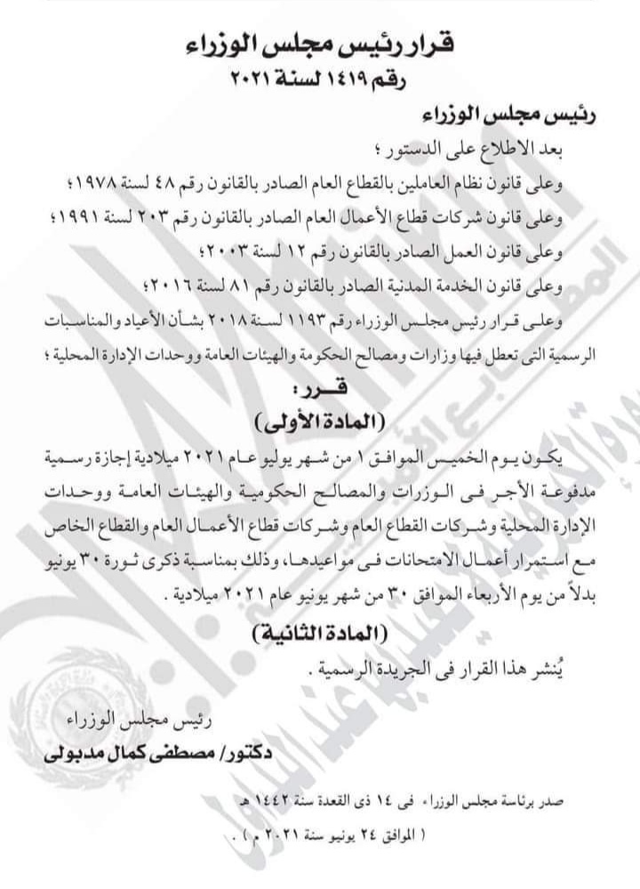 بعد الاطلاع على الدستور؛ وعلى قانون نظام العاملين بالقطاع العام، الصادر بالقانون رقم 48 لسنة 1978؛ وعلى قانون شركات قطاع الأعمال العام الصادر بالقانون رقم 203 لسنة 1991، وعلى قانون العمل الصادر بالقانون رقم 12 لسنة 2003؛ وعلى قانون الخدمة المدنية الصادر بالقانون رقم 81 لسنة 2016؛ وعلى قرار رئيس مجلس الوزراء رقم 1193 لسنة 2018؛ بشأن الأعياد والمناسبات الرسمية التي تعطل فيها وزارات مصالح الحكومة والهيئات العامة ووحدات الإدارة المحلية.