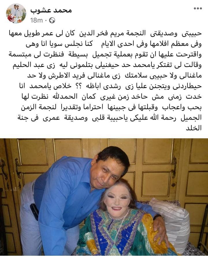 كشف الماكير محمد عشوب، حقيقة إجراء الفنانة مريم فخر الدين عمليات تجميل قبل وفاتها، وقال: “حبيبتي وصديقتي النجمة مريم فخر الدين، كان لي عمر طويل معها، وفي معظم أفلامها”.