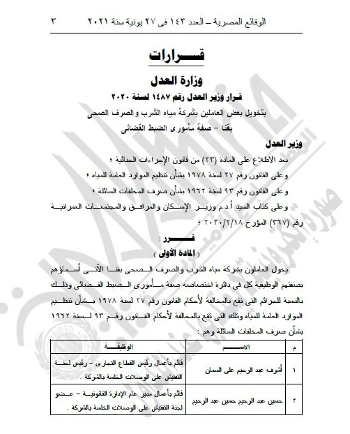 نشرت اليوم الأحد الجريدة الرسمية قرار وزير العدل المستشار عمر مروان رقم 1487  لسنة 2020 بمنح بعض العاملين بشركة مياه الشرب والصرف الصحي بقنا صفة مأموري الضبط القضائي.