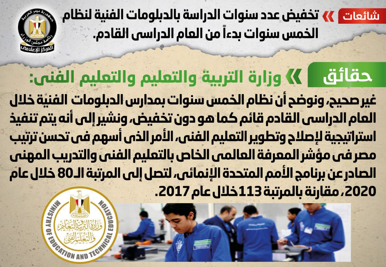 فيما تداولت بعض المواقع الإلكترونية وصفحات التواصل الاجتماعي، أنباءً بشأن تخفيض عدد سنوات الدراسة بالدبلومات الفنية لنظام الخمس سنوات بدءًا من العام الدراسي المقبل.