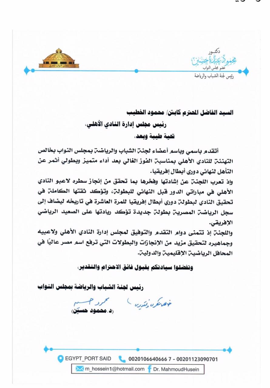 وقال حسين في خطابه للأهلي: “أتقدم باسمي وباسم أعضاء لجنة الشباب والرياضة بمجلس النواب بخالص التهنئة للنادي الأهلي بمناسبة الفوز الغالي بعد أداء متميز وبطولي أثمر عن التأهل لنهائي دوري أبطال إفريقيا”.