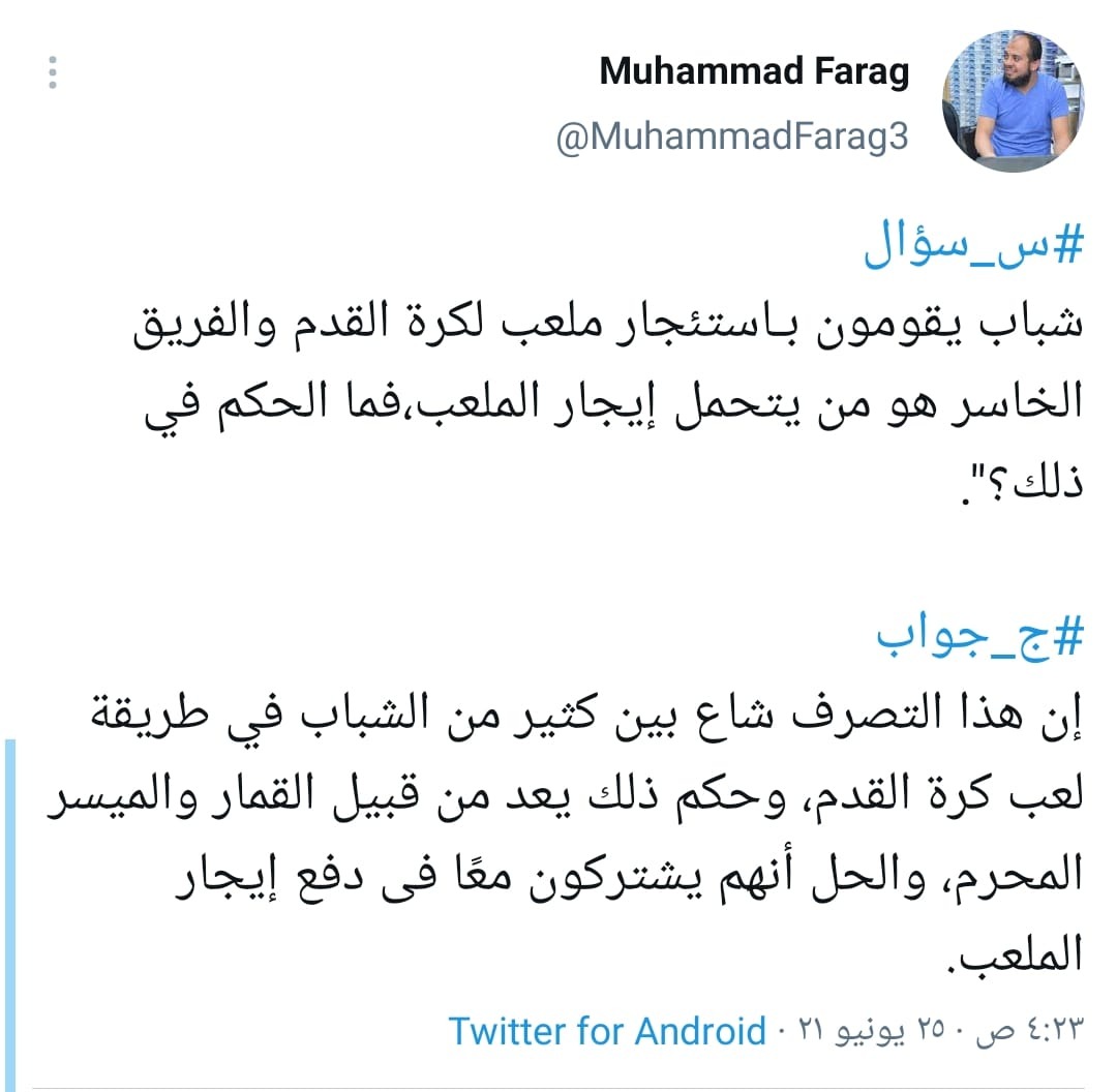 تداول مستخدمو موقع التواصل الاجتماعي “تويتر” تغريدة، تتضمن سؤالا عبر حساب داعية إسلامي يُدعى محمد فرج، بشأن الاستفسار عن حكم الدين في دفع اللاعبين الخاسرين إيجار ملعب كرة القدم بعد الانتهاء من المباراة.