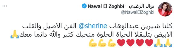 وكتبت نوال الزغبي تغريدة عبر حسابها الشخصي بموقع التغريدات القصيرة “تويتر”: “كلنا شيرين عبد الوهاب، الفن الأصيل والقلب الأبيض، بتلبقلا الحياة الحلوة، منحبك كتير والله دائما معك”.