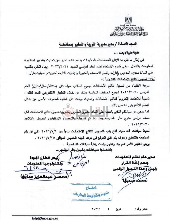 وجهت وزارة التربية والتعليم، المديريات، بشأن تحديث وتطوير المنظومة المعلومات بالكامل، بالتنبيه على مديري المدارس وإدارات وأقسام الإحصاء بالمديرية، بتسجيل نتائج الامتحانات إلكترونيًا.
