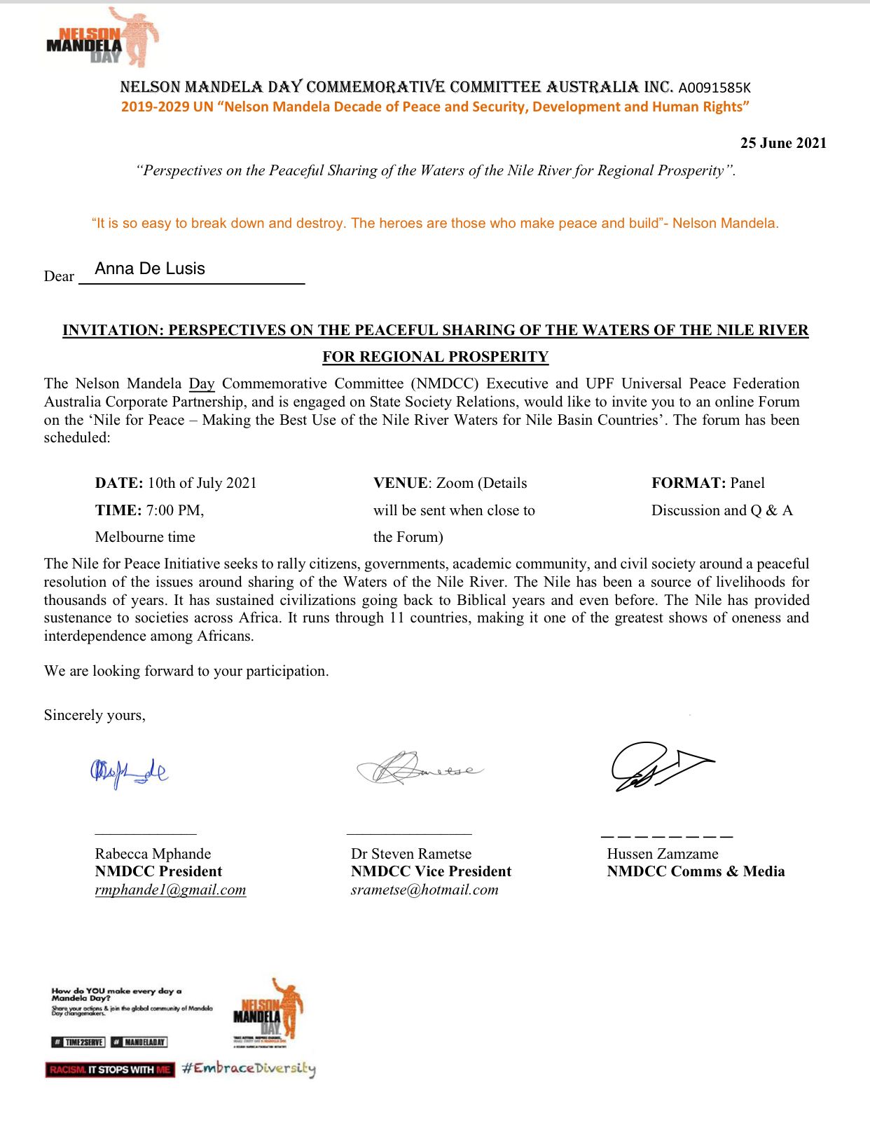 وصرحت اللجنة الأسترالية بأنه في الوقت الذي تُعبر فيه الشعوب عن آرائها حول ضرورة حماية نهر النيل، قد حان الوقت لسماعهم قبل أن يفوت الأوان، موضحة في تقريرها: "حان الوقت لاتخاذ خطوات حقيقية وجدية في ظل هذه الأوقات الصعبة".