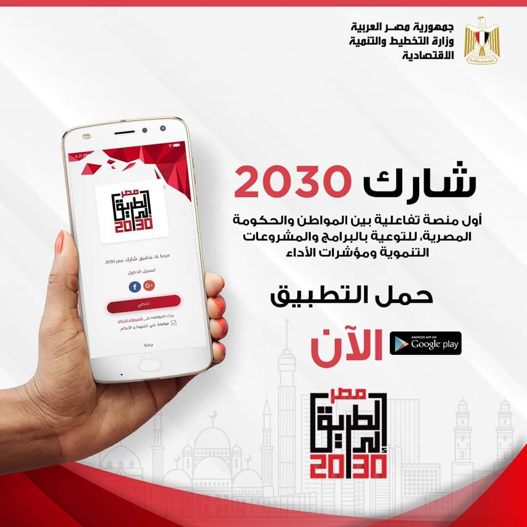 يعد تطبيق “شارك 2030” تطبيقًا إلكترونيًا تفاعليًا، أطلقته وزارة التخطيط والتنمية الاقتصادية، كحلقة وصل مع المواطن، للتوعية بالبرامج ومشروعات التنمية، التي تطلقها الدولة في ظل تطبيق مبدأ الشفافية التي تتبناه كأحد أهم أهداف التنمية المستدامة.