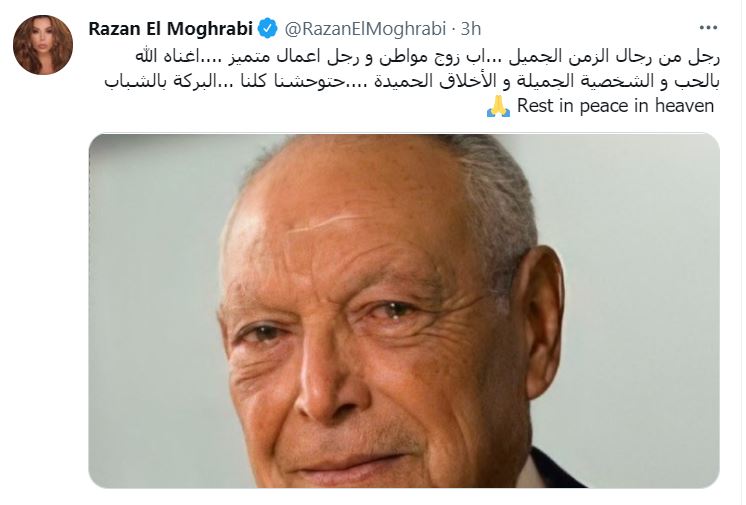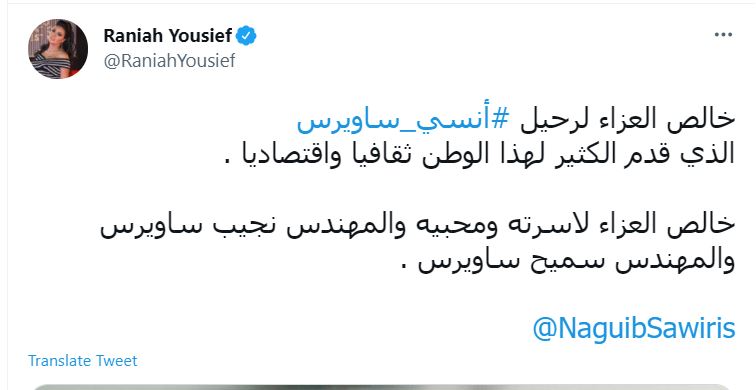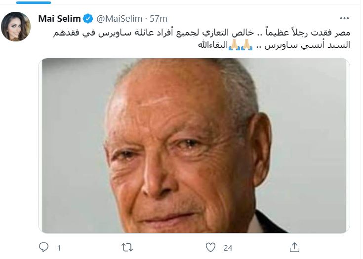 ونشرت مي سليم عبر حسابها بموقع "تويتر": "مصر فقدت رجلا عظيما.. خالص التعازي لجميع أفراد عائلة ساويرس في فقدهم السيد أنسي.. البقاء لله".