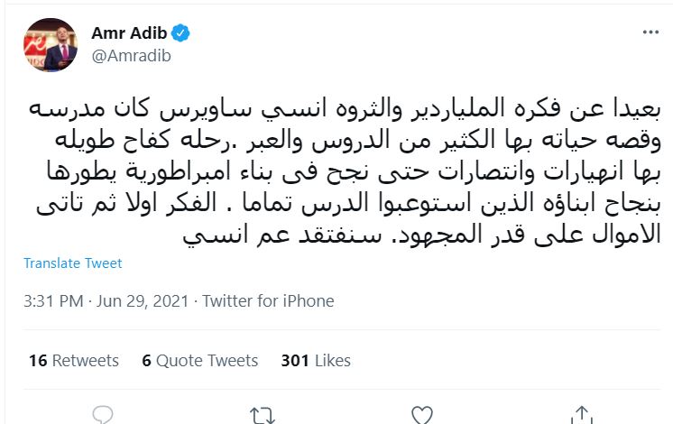 وأعرب الإعلامي عمرو أديب عن حزنه عبر حسابه بموقع "تويتر" قائلا: بعيدًا عن فكرة الملياردير والثروة، أنسي ساويرس كان مدرسة وقصة حياته بها الكثير من الدروس والعبر.. رحلة كفاح طويلة، بها انهيارات وانتصارات حتى نجح في بناء إمبراطورية يطورها بنجاح أبناؤه الذين استوعبوا الدرس تماما.. الفكر أولا ثم تأتي الأموال على قدر المجهود.. سنفتقد عم أنسي".