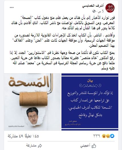 وأضاف الخمايسي عبر صفحته الشخصية على موقع التواصل الاجتماعي “فيس بوك”: “أفادني الناشر، بأن الكتاب اتخذ كل الإجراءات القانونية اللازمة لصدوره من موافقة الجهات الرسمية، وأن موافقة الجهات كانت على المتن وعلى الغلاف بهذا التصميم المعلن”.
